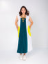 The dress features a bold teal green center panel, framed by clean white sides that bring balance and brightness. But the real twist? Oversized lemon yellow pockets that add a pop of personality — and functionality — to your look. The sleeveless silhouette and open neckline make it an easy, breathable choice for sunny days or bold nights out.