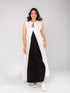 The silhouette is effortlessly flowy with a dramatic A-line shape, featuring a deep black center panel framed by crisp, elegant white. The sleeveless cut and subtle V-neck keep it cool and flattering, while the monochrome palette gives it timeless edge and versatility.