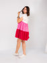 The color-blocked tiers — creamy white, soft pink, and rich raspberry — give this dress a layered charm that’s full of personality. Delicate ruffled sleeves add a romantic twist, while the relaxed A-line shape makes it easy to wear for any body type.